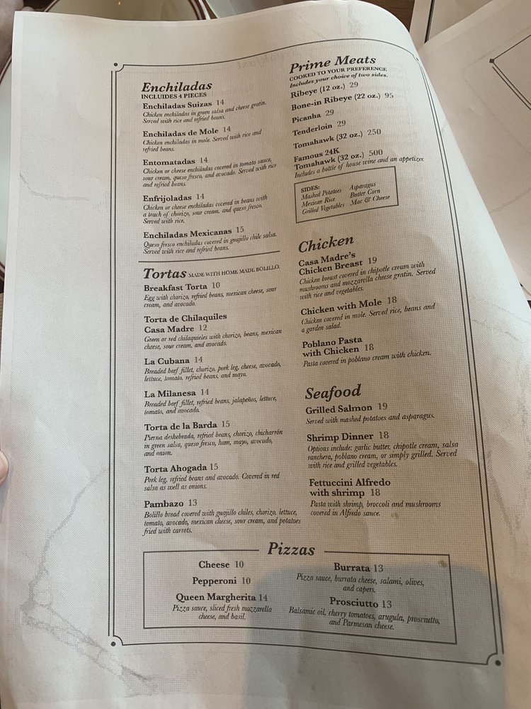 Serves . Angus beef oz. Porter house filet mignon. oz. Picanha steak. oz. Ribeye. Served with sausage, mashed potatoes, and rice. Includes i concha de la abuela.